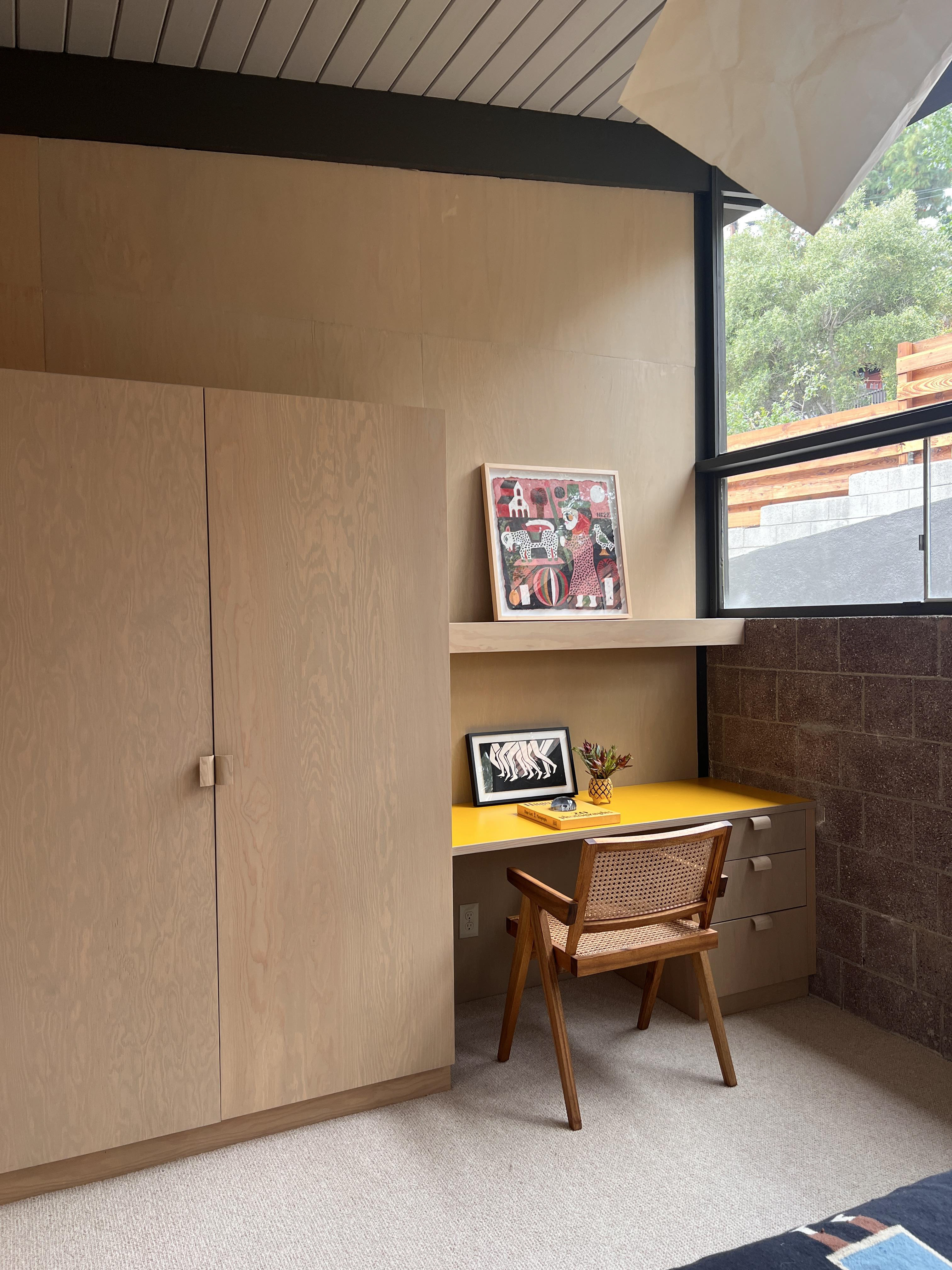 Scarce paint samples informed a custom stained + painted plywood language throughout the home to match the restored brick and redwood siding. A redesigned kitchen drew inspiration from elegantly simple, curved plywood handles.