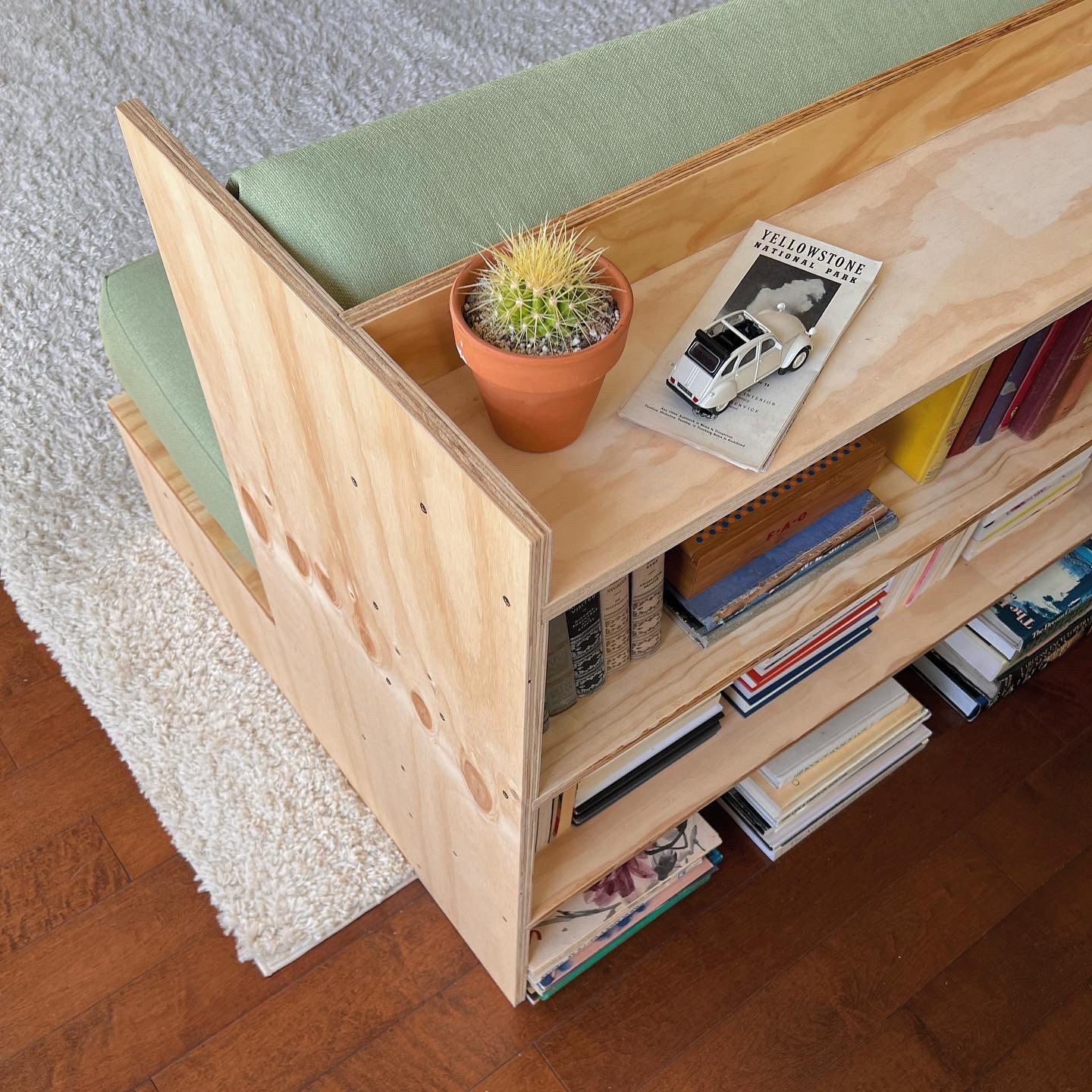 The Library Sofa was created specifically to accommodate a solution for lovers of collecting, reading, and relaxing. The sofa functions as a bookshelf, daybed, and storage to conserve precious space. The result is an angular couch with a built in armrest/desk and multiple shelves, using a flat pack system to accommodate transport and moves.