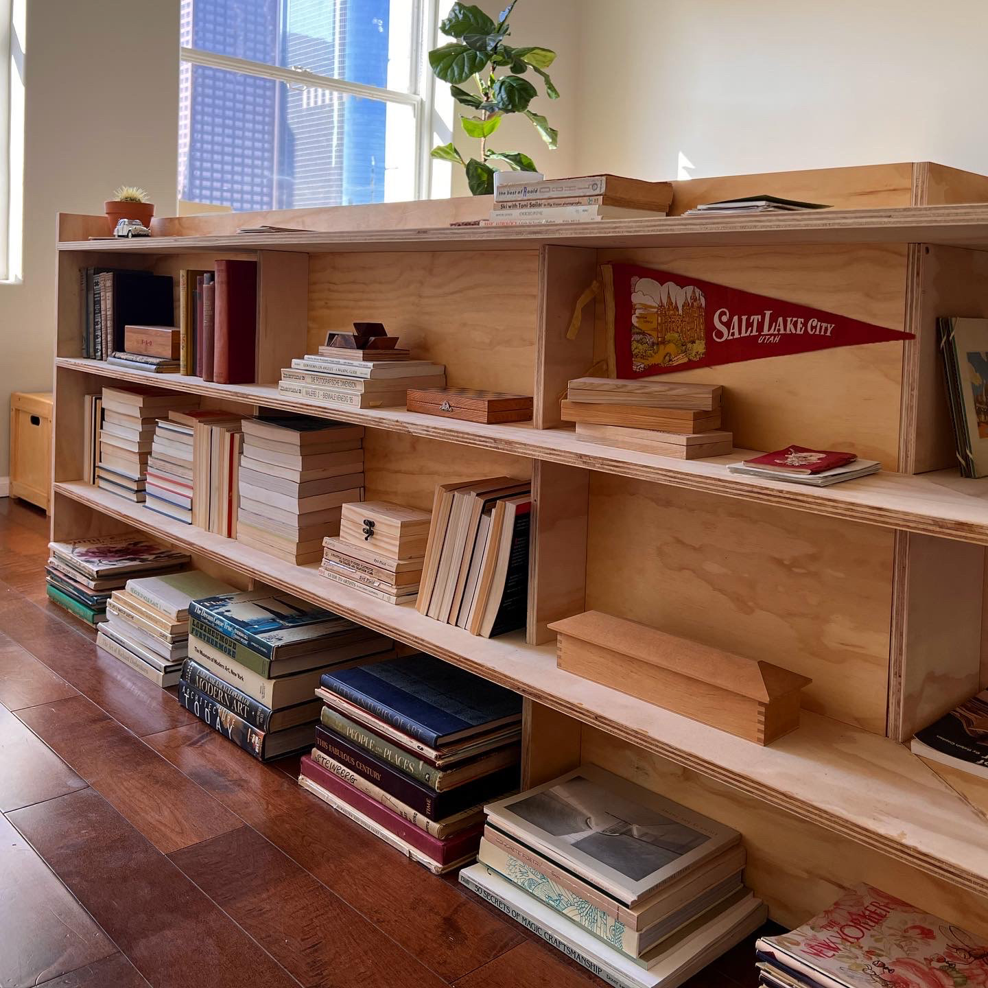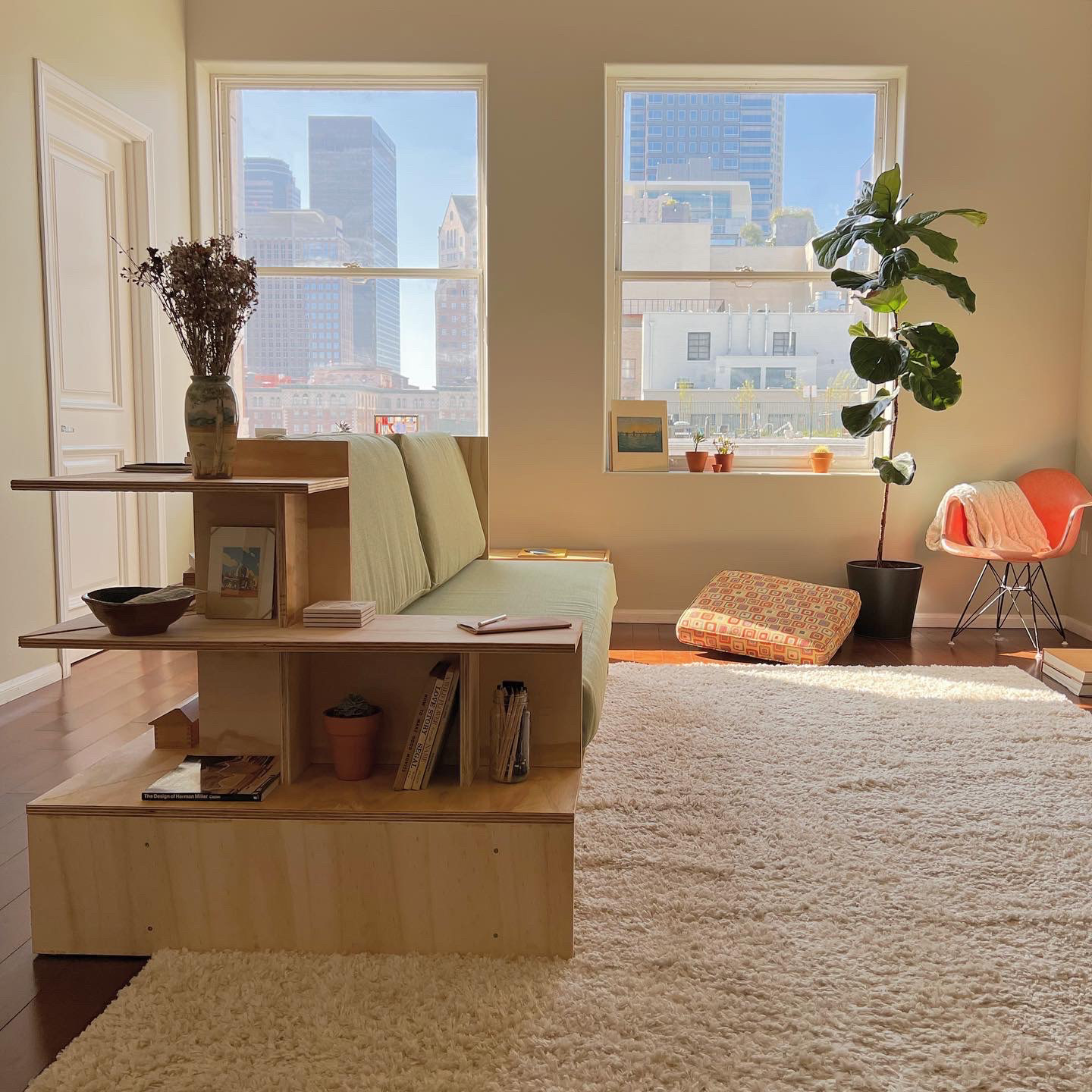 The building process began with inspiration from studying built-in furniture of California Modernists, combining their natural approach of material and utilitarianism with a Donald Judd-esque lens of angularity and simplicity.